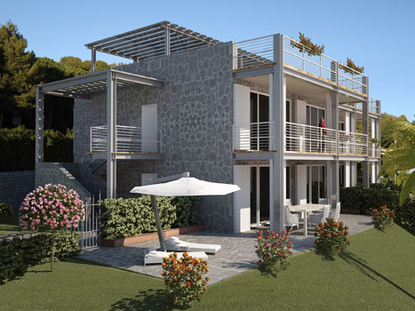 Il progetto, che consiste nella rielaborazione di un progetto urbanistico precedentemente approvato, rispetta la disposizione e le volumetrie degli edifici già autorizzati dagli enti comunali, provinciali e regionali, modificandone le coperture, risolte a tetto piano praticabile e originariamente previste a falde in coppi tradizionali, i loggiati e le scale esterne, previsti in muratura nel progetto originale e sostituiti da più esili elementi metallici, la disposizione e l’ampiezza dei serramenti esterni, risolti ad ante scorrevoli di grandi dimensioni, i rivestimenti in pietra locale a spacco al posto dell’intonaco, la divisione e la distribuzione interna delle unità immobiliari.